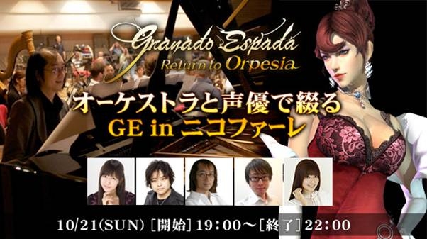 ハンビットユビキタスエンターテインメントは、「グラナド・エスパダ」において、10月21日19:00より、オーケストラと声優でつづる「GE in ニコファーレ」を開催し、ニコニコ公式生放送にて生放送中継を実施する。また、本日10月19日からは「フリーデの災難」イベントを開催している。