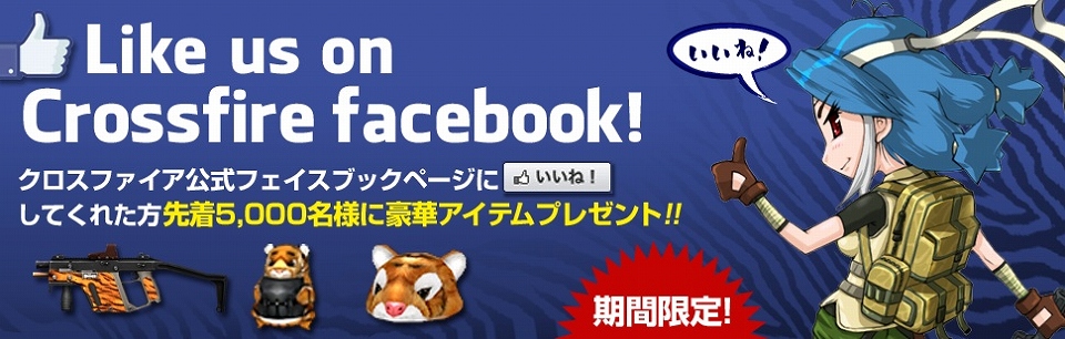今回、Facebookを通じてイベントを開催いたします!クロスファイア公式Facebookの「いいね!」をクリックしていただいた方、先着5000名様に、素敵なアイテムをプレゼント!皆様、ぜひこの機会にご参加ください。