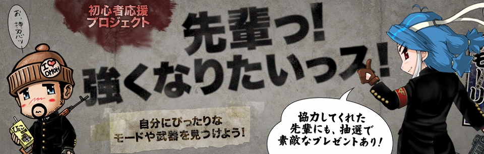 初心者応援イベント「先輩っ!強くなりたいっス!」を開催しました!訓練兵~上等兵の方は、指定されたミッションをクリアすることにより、期間制武器を手に入れることができます!また兵長1号以上の方は、「初心者にお勧めだと思う武器」に投票をしていただくと、抽選で100名様に素敵なアイテムをプレゼントいたします!
