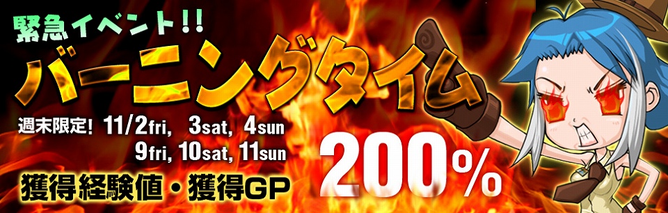 いよいよ冬本番となってまいりましたが、そんな寒さを吹き飛ばすべく「バーニングタイム」を実施いたします!イベント期間中は、獲得経験値と獲得GPがなんと200%にアップ!さらに11月10日は毎月恒例、「クロスファイア(X)の日」と重なるため、獲得経験値200%アップに加えて、獲得GPが250%にアップ!週末はぜひともクロスファイアをお楽しみください!