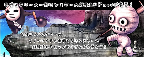 登場するモンスターは上へ進む程強くなりますが、今回は41階から70階までに出現するモンスターの経験値やドロップアイテムをリニューアルいたしました。
