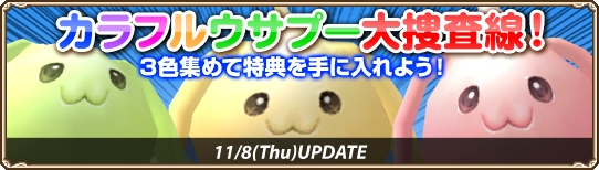 3.カラフルウサプーが早く発見されたワールドに、種類に応じたポイントを加算いたします。ポイント数に応じ、経験値とドロップ率のボーナス設定を後日実施させていただきます。