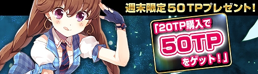 期間中、TPを20ポイント以上購入したキャラクターに、後日50TPをプレゼントいたします。