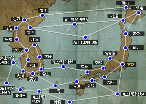 今回使用される地図は下のように東京、大阪、沖縄、ソウル、釜山など、日本と韓国の実在する都市や日本海、太平洋沖の海上戦闘地域になります。