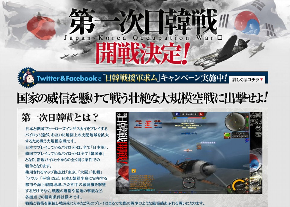 日本と韓国でヒーローズインザスカイをプレイするパイロット達が、お互いに地図上の支配地域を拡大するために戦う大規模空戦です。日本でプレイしているパイロットは、通常の所属陣営やサーバーの分け隔てなく全て「日本軍」、韓国でプレイしているパイロットは全て「韓国軍」となり、全パイロットが全く同じ条件で戦う戦争となります。