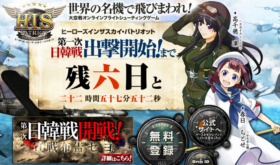 「第一次日韓戦」は日本と韓国でヒーローズインザスカイをプレイするパイロット達が、お互いに地図上の支配地域を拡大するために戦う大規模空戦です。日本でプレイしているパイロットは、通常の所属陣営やサーバーの分け隔てなく全て「日本軍」、韓国でプレイしているパイロットは全て「韓国軍」となり、全パイロットが全く同じ条件で戦う戦争となります。