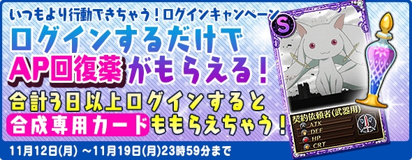 「魔法少女まどか☆マギカ オンライン」は昨日、2012年11月12日(月)より、「いつもより行動できちゃう!ログインキャンペーン」を実施中です!毎日1回ゲーム内にログインをするだけで、[AP回復薬]を獲得するチャンス!そして、キャンペーン実施期間中に合計 3日間ログインをすると、なんと!「合成専用カード[契約依頼者(武器用)]」が 2枚もらえます!
