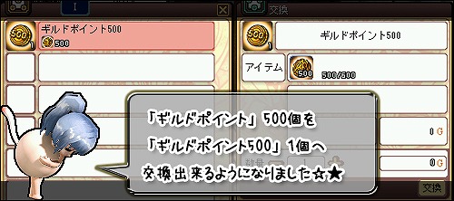 ギルドポイントは様々なアイテムと交換できるポイントで、ギルドクエストをクリアすることで獲得できます。貯まったギルドポイントをより気楽により便利に所持できるよう、500ポイントを1つのアイテムにしてくれる「ギルドポイント両替システム」を実装いたしました。