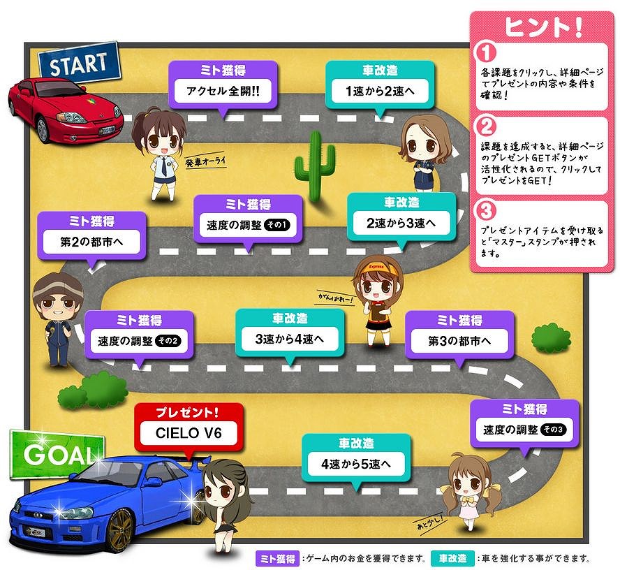 2012年11月21日(水)より、新規のプレイヤーを対象にした新サービス、「運転のしおり」を開始いたしました!初心者クエストからレベル31までのゲーム進行をサポートし、お手持ちの車をグレードアップできるアイテムや、ゲーム内通貨を受け取ることができます。