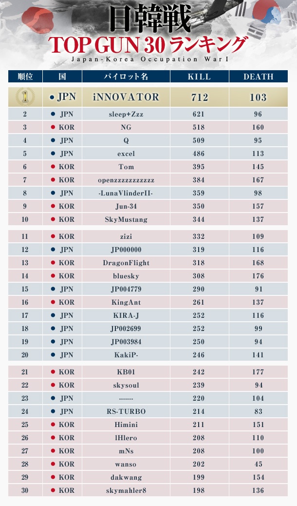 11月23日(金)~11月25日(日)に開催された第一次日韓戦は日本(81.3%) 対 韓国(18.8%)で日本の勝利で幕を下ろしました。熱い戦いを繰り広げてくれた皆様の日韓両国を合わせたTOP30ランキングとMVPを以下に公開いたします。