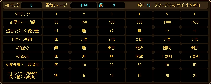 本日のアップデートにて、「VIP 機能」が実装されました。「VIP 機能」とは、スターズの累計チャージ額に応じて、ランクが変化するシステムです。プレイヤーのVIP ランクによって、利用できる各種ゲーム内機能が解放されていきます。