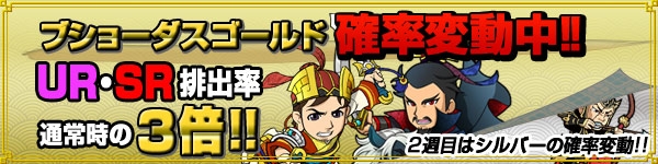 1週目のブショーダスゴールド確率変動時は、UR/SRの排出率が通常時のなんと【3倍】!2週目のブショーダスシルバー確率変動時は、UR/SR/Rの排出率が通常時の【2倍】!通常では手に入れにくい武将カードをゲットする大チャンス到来!