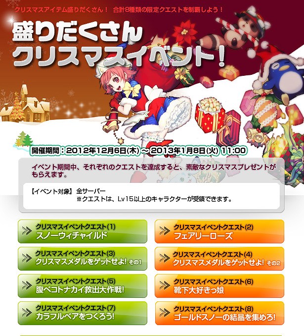 今年の冬はイベント盛りだくさん!なんと8種類のイベントが同時開催されます!いずれもレベル15以上のキャラクターであれば受けられる簡単な内容となっております。