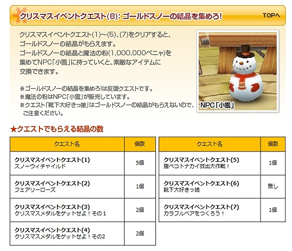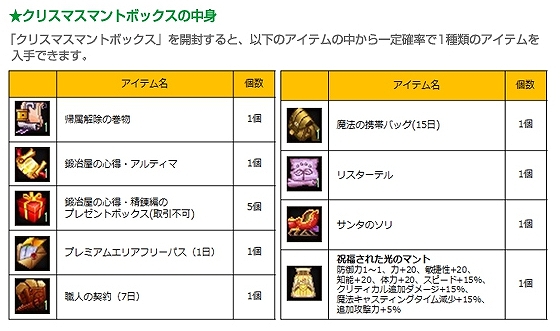 各クリスマスイベントをクリアすることで手に入る「ゴールドスノーの結晶」を集めて貰えるクリスマスマントボックスからは、超高性能マントが入手できます!ぜひ挑戦してみて下さい!