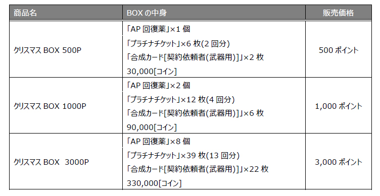 ・「クリスマスBOX」ご購入時に、「プラチナチケット」、「AP回復薬」、「合成専用カード[契約依頼者(武器用)]」のいずれかの所持数が上限を超える場合、「クリスマスBOX」を購入することができません。対象のアイテムを消費していただいた後に、再度ご購入いただけますようお願い致します。