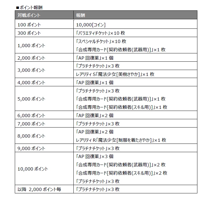 キャンペーン実施期間中の「対戦ポイント」報酬に、レアリティS「魔法少女[美樹さやか]」とレアリティR「魔法少女[制服を着たさやか]」が追加されます。