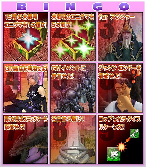 また、「BINGO」の達成ライン数によって、サーバー全体で実施される褒賞がグレードアップいたします。モンスターの討伐時に獲得できる経験値上昇、くしくもモンスターとの戦闘に敗れ死亡してしまった際に、与えられるデスペナルティが軽減される等、冒険者の皆様には大変嬉しい内容となっております。