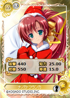 今回の目玉は、駒都えーじさん描き下ろしの「ナノカ・フランカ(SS)」、「アマネカ・マッハバスター(SS)」、「カル・ルスラン(S)」の3枚となり、時期に合わせてサンタ衣装や巫女服、着物での限定イラストとなっております。