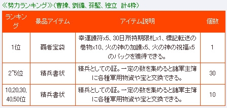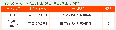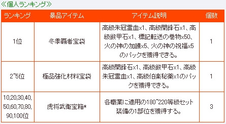 イベント期間中、指定された国戦ランキングの順位に入賞された方に、豪華報酬をプレゼントいたします。ランキングは「個人」「職業」「勢力」の3部門に分かれており、ランクインのチャンスが大幅にUPしました。豪華賞品の獲得を目指して、国戦祭りであなたの名を馳せましょう!