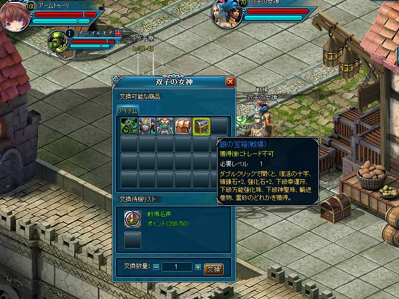 毎日21:30から開催されている戦場で獲得できる戦場名声と交換で、ミッドガルドの双子の女神から「銀の宝箱(戦場)」を獲得することができます。銀の宝箱(戦場)からはアクセサリーの細工を行うために必要な「霊砂」やペットの神聖攻撃を上昇させる「下級神聖珠」が出現することがあります。