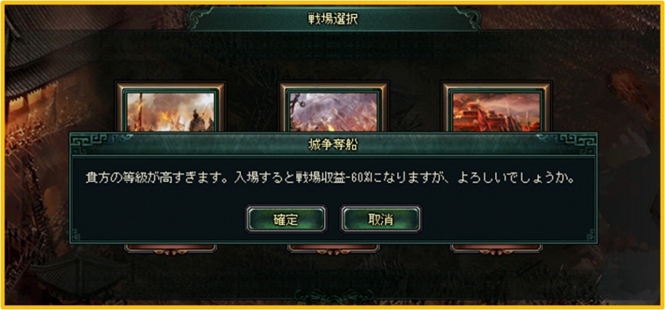「城争奪戦」は3 つの戦場に分かれており、戦場の難易度によって「軍勲」の獲得数が異なります。また、戦場の指定等級より参加者の等級が高い場合、「軍勲」の獲得数が減少します。
