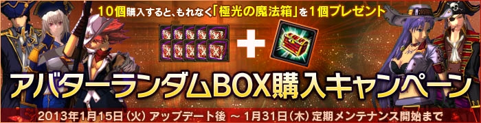 ※キャンペーン対象となる「アバターランダムBOX」のご購入数の上限は50個までです。それ以上ご購入いただいた場合でも、プレゼントアイテム「極光の魔法箱」の最大配布数は5個までとなりますのでご注意ください。