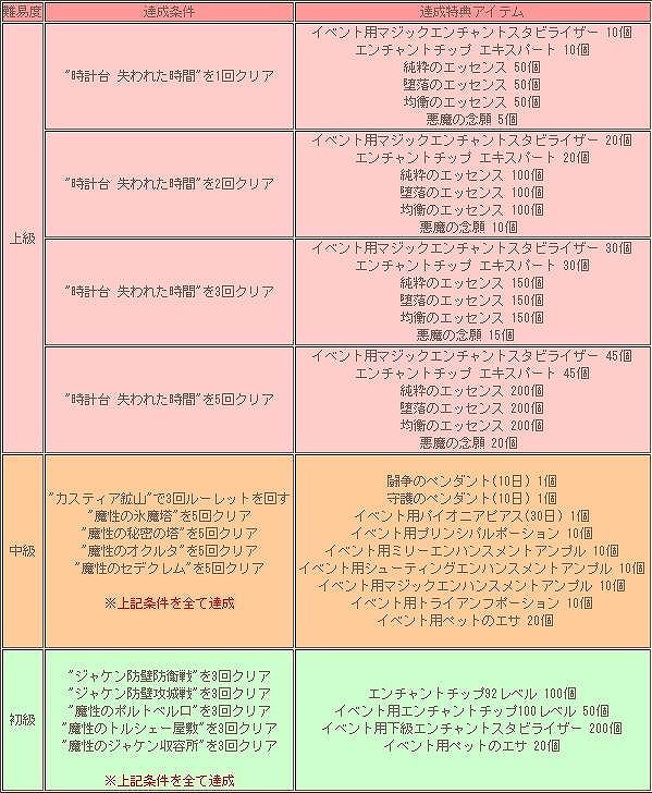 初球から上級まで、装備強化からステータス強化、アーティファクト素材など幅広い報酬が出揃った。注目はなんといっても“悪魔の念願”と“マジックエンチャントスタビライザー”だろう。手持ちの武器防具にもっと強化したかった装備はないだろうか? この機会に良エンチャントの獲得を狙ってほしい。