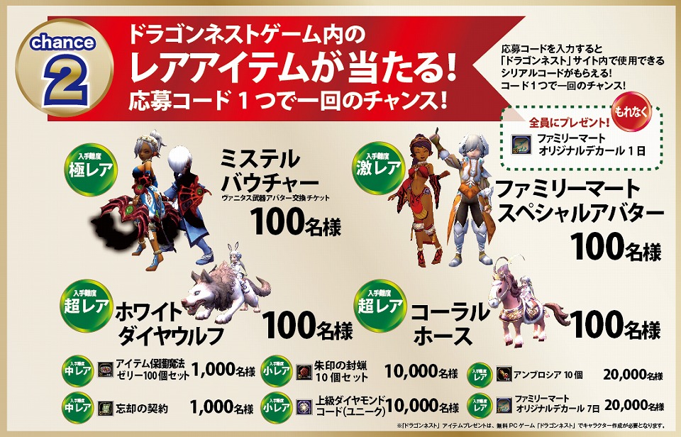 ゲーム内でとても強力なヴァニタス武器アバターと交換できるチケット「ミステルバウチャー」やここでしか手に入れることができない「ファミリーマート スペシャルアバター」、入手困難なゲームアイテム「ホワイトダイヤウルフ」「コーラルホース」をはじめとした極レアアイテムを抽選でプレゼント。