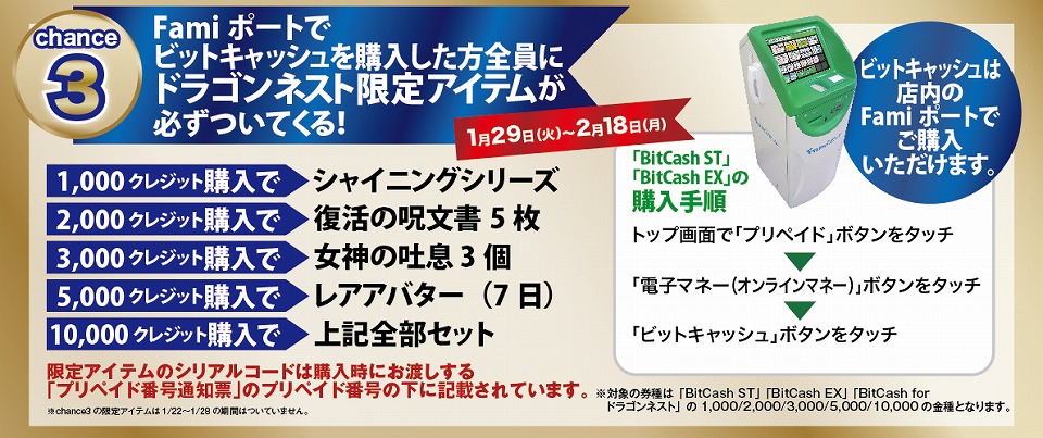 チャンス3:Famiポートで対象のビットキャッシュを購入した方全員にドラゴンネスト限定アイテムが必ずついてくる!