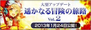 お待たせいたしました! 2012年12月6日に公開された大型アップデート「遥かなる冒険の旅路」vol.1に続き、vol.2を2013年1月24日に公開いたします! 新たなる冒険へと誘うように、新マップと新ダンジョンがさらに追加されます! お楽しみに!