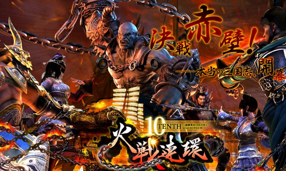 「三国群英伝ONLINE2」大型アップデート第10 弾「火戦連環」が2013年1月21日(月)に実施決定いたしました。今回のアップデートでは等級上限の解放をはじめ、新技能や新装備、新マップが続々登場し、今までの戦いをより一層盛り上げていきます。