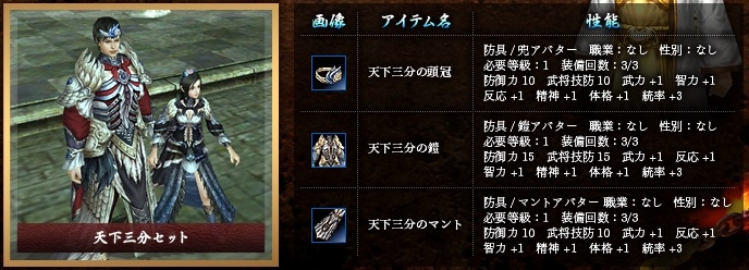 「天下三分セット」は全ての部位に“統率+3”効果がついており、これまでに無い強力な性能となっております!1 キャラクターにつき1 セット受け取れますので、「天下三分セット」を身につけて戦場を駆け回ろう!