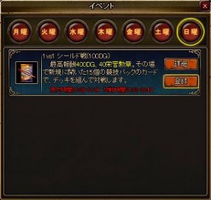 受付時間(21:00~21:30)の間にゲーム画面の左側にある[イベント]ボタンからイベント画面を開き、シールド戦の[登録]ボタンを押します。1つの組には16~31人のプレイヤーが割り当てられます。1vs1 シールド戦(100DG)に登録して参加できなかった場合、参加費用はゲーム内メールにて返却されます。