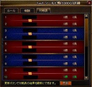 シールド戦に参加したプレイヤーは、21:30からイベント画面よりシールド戦のルーム画面に入場できます。ルーム画面で[対戦表]ボタンを押すと、自分が所属する組と、最初の試合の対戦相手を確認することができます。