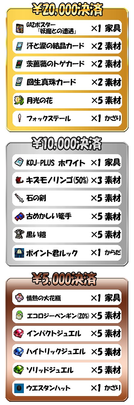 2013年1月31日(木)のメンテナンス終了後から2013年3月14日(木)9時59分までの間、一度に5000円以上の課金決済をされた方に素敵なプレゼントを致します。