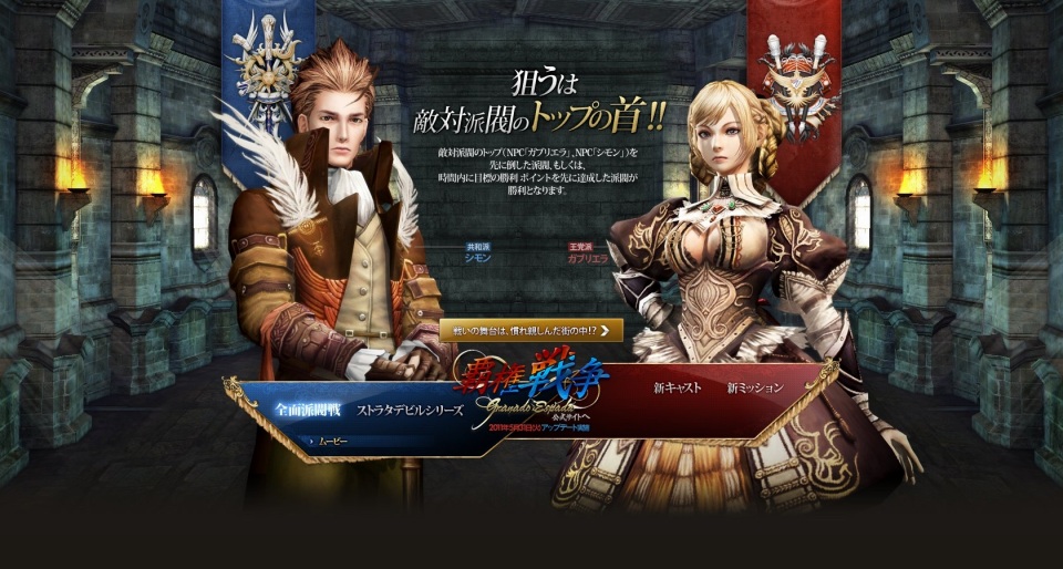 大陸“グラナド・エスパダ”の二大勢力「王党派」「共和派」が遂に激突!政治的に対立する両党の指導者“シモン=アイェンデ”(NPC「シモン」)、“ガブリエラ姫”(NPC「ガブリエラ」)の首を狙う、“大規模対人戦”なのです。