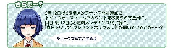 さらに!2013年2月12日(火)定期メンテナンス開始時点で、トイ・ウォーズのゲームアカウントをお持ちの方全員に、同日の定期メンテナンス終了後にトイ・ウォーズのキャラクター「春日トワ」より、ゲーム内のプレゼントボックスに“何か”届いているとか……?その真相を、ぜひゲーム内にログインして確かめてみてください!