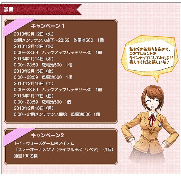 期間中、ゲームにログインするだけで、お得なトイ・ウォーズ内アイテムを日替わりでプレゼントするゲーム内イベント「『毎日ログインキャンペーン』ナルミ一号機からのバレンタインプレゼント!!」が2013年2月12日(火)定期メンテナンス後よりスタートします!