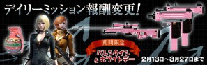 デイリーミッションをクリアすると手に入る報酬アイテムを期間限定で変更しました!この期間にしかゲットすることの出来ない珍しいグレネードや、ピンク色のスキンを施した武器などが勢揃い!どうぞこの機会に手に入れてみてください!