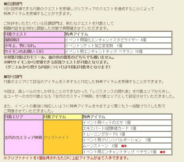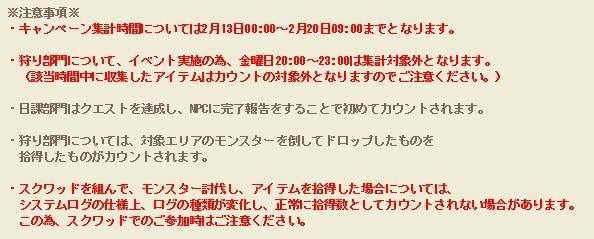 2013年2月13日(水)メンテナンス終了後から、2013年2月20日(水)定期メンテナンス開始までの間に条件を達成することで、特典アイテムを受け取ることができます。