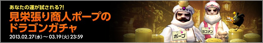 NHN Japanは、「ドラゴンネスト」において、本日より「見栄張り商人ポープのドラゴンガチャ」イベントを実施する。