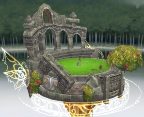 「神域・アヴァロン」は、飛空庭をどこかにあるという伝説の楽園のようにできます。さらに「神秘の聖杯」を使用すると、飛空庭の周りが森に囲まれた湖の上空にいるかのような景色に!