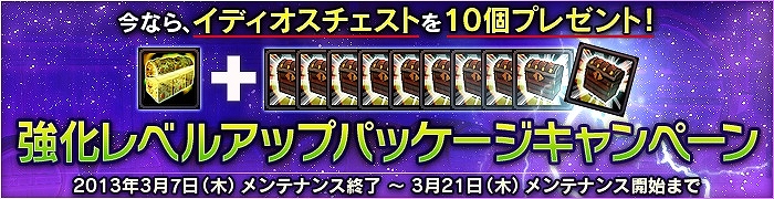 ※キャンペーンの対象となる「強化レベルアップパッケージ(30日)」のご購入個数は1個までです。2個以上ご購入いただいた場合でも、プレゼントアイテム「イディオスチェスト」は10個ですので予めご了承ください。