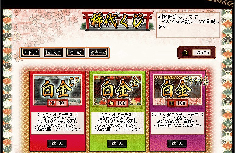 討伐の報酬で、プラチナ玉を取得します。<稀代くじ>内の「白金くじ」から、プラチナ玉を増やすくじが引けます。くじの結果によっては、所持しているプラチナ玉が減る場合もあります。