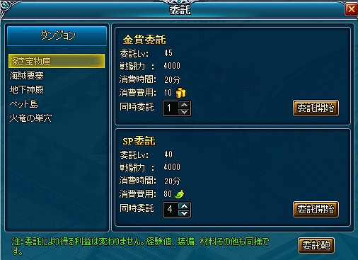 ダンジョン委託を行うのに必要なキャラクターレベルと戦闘力は、ダンジョンによって異なります。委託の実行には金貨もしくはSPと、ダンジョンの挑戦回数を消費し、消費時間経過後に、経験値とアイテムを入手することができます。金貨の場合は1度に挑戦回数の1回分しか行えませんが、SPの場合は1度に最大回数を実行することが可能です。