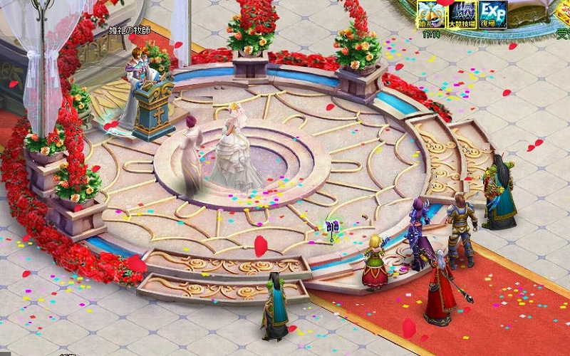 式中、新婦は「ブーケ・トス」を使用し、式場内にいるキャラクター1人に「バラ9本」を贈ることができます。また、他のキャラクターは祝福を行うことができます。結婚式場では酒宴と同じように、一定時間毎に経験値を獲得でき、乾杯が行えます。