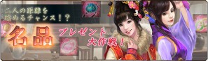 2013年3月22日(金)メンテナンス後より、名品プレゼントイベント第2弾を開催いたします。イベント期間中、指定条件を満たしたスクリーンショットを公式サイトのお問い合わせフォームに投稿して頂くと、もれなく全員に豪華アイテム「名品」をプレゼントいたします。