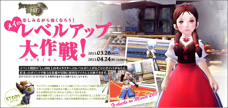 NHN Japanは、「ドラゴンネスト」において、本日3月26日よりイベント「メイのレベルアップ大作戦!」を実施する。