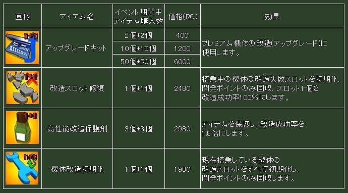 (例、「アップグレードキット10個」を購入すると、「アップグレードキット10個+10個」がアイテム格納庫の機能タブに支給されます。)