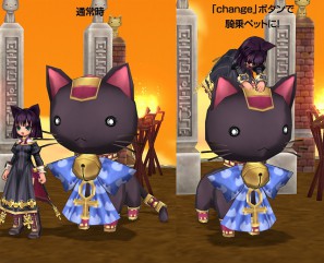 「イリスと記憶の書架~四の物語:仔猫の神様」に登場する「バステト・ロア」がペットになってECOくじに登場!「change」ボタンで、エフェクト装備の「バステト・ソウル」か、杖の一種の「バステトのシストルム」に変更できちゃいます!